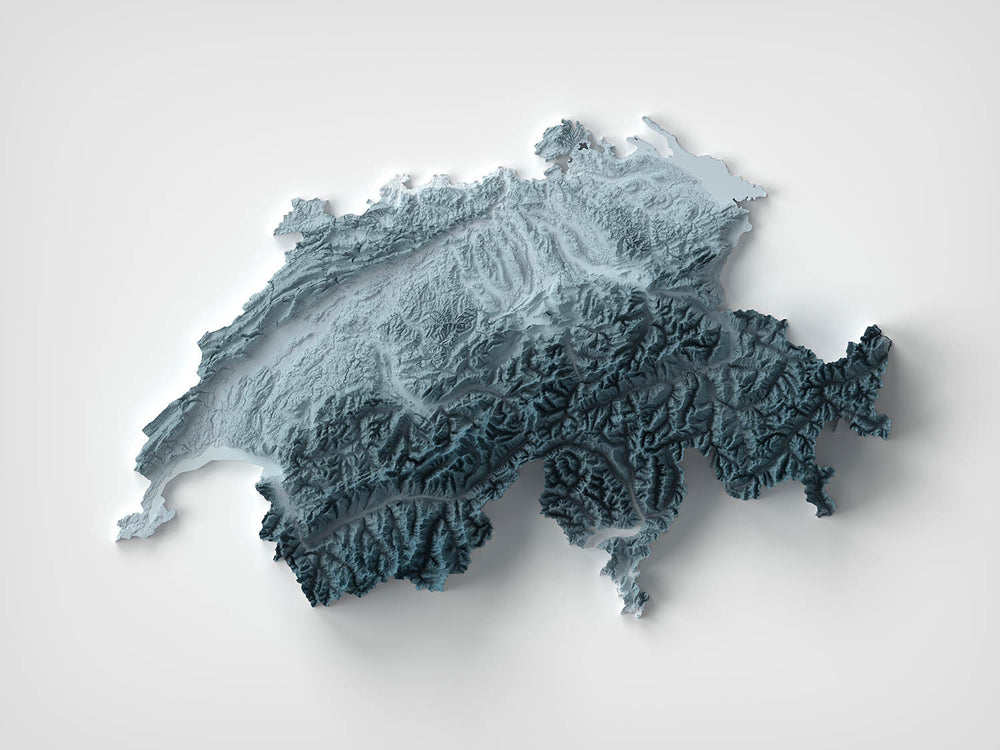Switzerland’s landscape is a breathtaking celebration of dramatic relief and natural artistry, and this map captures its essence in exquisite detail. The towering Alps dominate the southern and central swathes, with soaring ridges and needle-sharp peaks that cast deep shadows across the surrounding land. The interplay of light and shadow on the map accentuates the extreme verticality of these mountains, highlighting the rugged summits of icons like the Matterhorn and Dufourspitze, as well as the many glacier-carved cirques and precipitous valleys that descend toward the foothills.