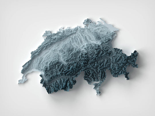 The whole map is a study in contrasts— Alpine passes winding through imposing massifs, high meadows perched above dizzying drops, and river valleys threading their way from snow-laden heights to the lowlands. Each ridge and hollow is brought to life by careful shading that invites you to trace Switzerland’s topography with your fingertips, as if running your hands along the country’s real contours. This map is not just a depiction of geography—it is an invitation to explore the awe-inspiring relief that makes Switzerland truly unique.