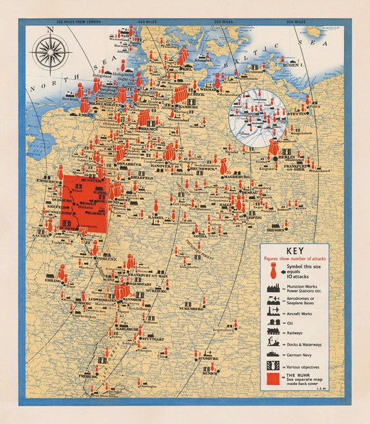 The map shows that The Ruhr region of Germany, which was the centre of German heavy industry during World War 2, was bombed so heavily that you had to turn the map over to see all the bombs. (Sadly, the map sold here does not include the separate Ruhr map!)