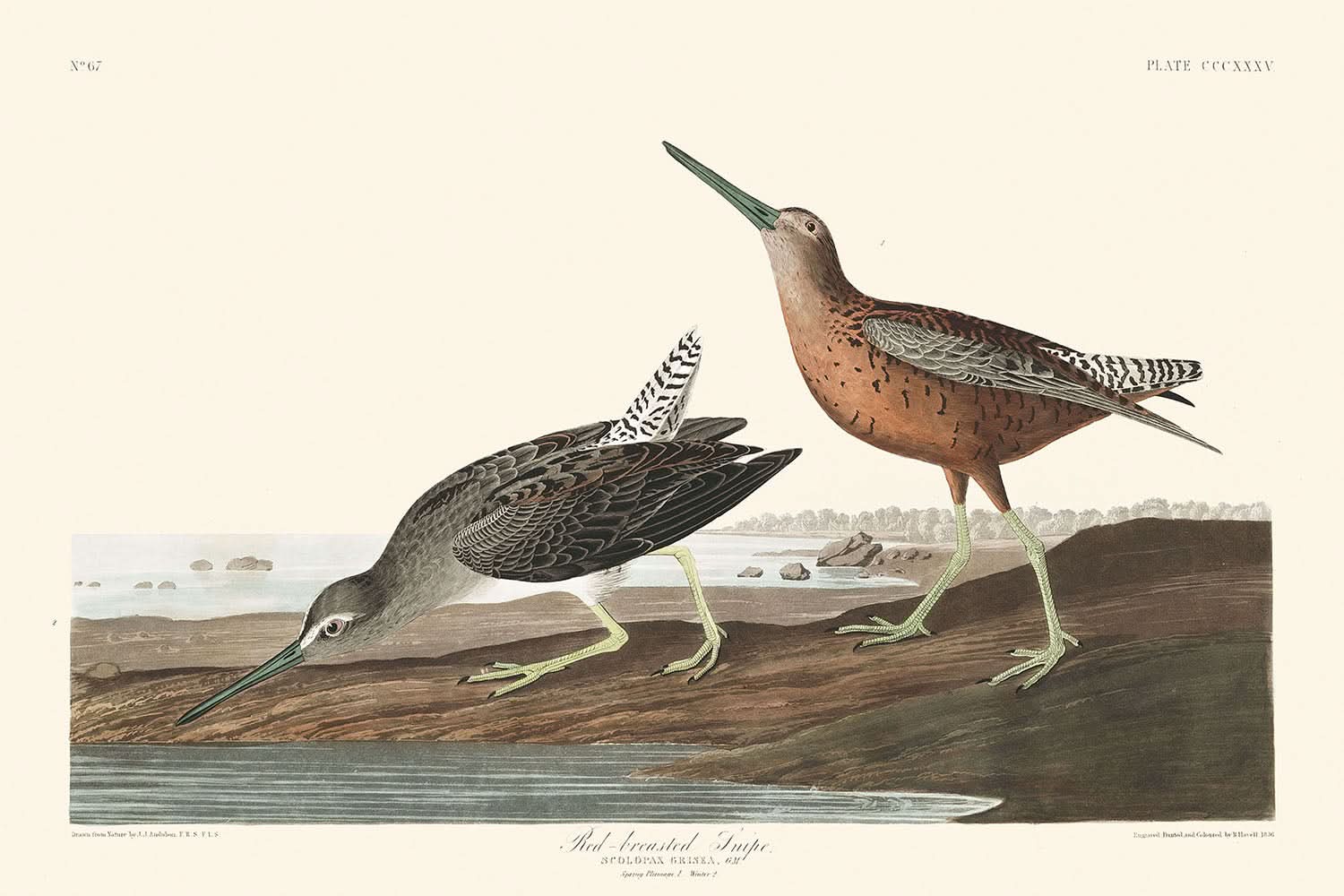Red-breasted Snipe (Plate 335), originally illustrated by the celebrated John James Audubon, captivates viewers with its vivid depiction of this remarkable bird species. Part of Audubon's renowned Birds of America series, this work was published in 1827—a collection acclaimed for its life-size representations and meticulous detail.