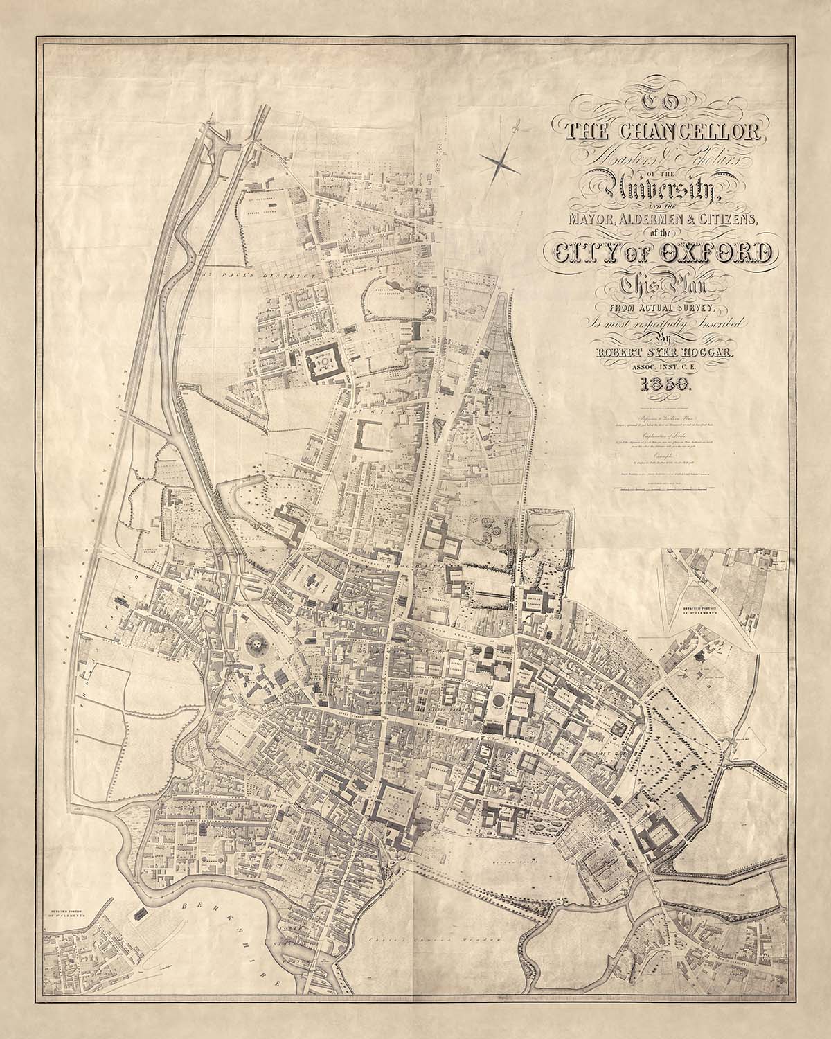 Large Old Map of Oxford by Hoggar, 1850: Colleges, St. Giles', High St, Magdalen St, River Thames
