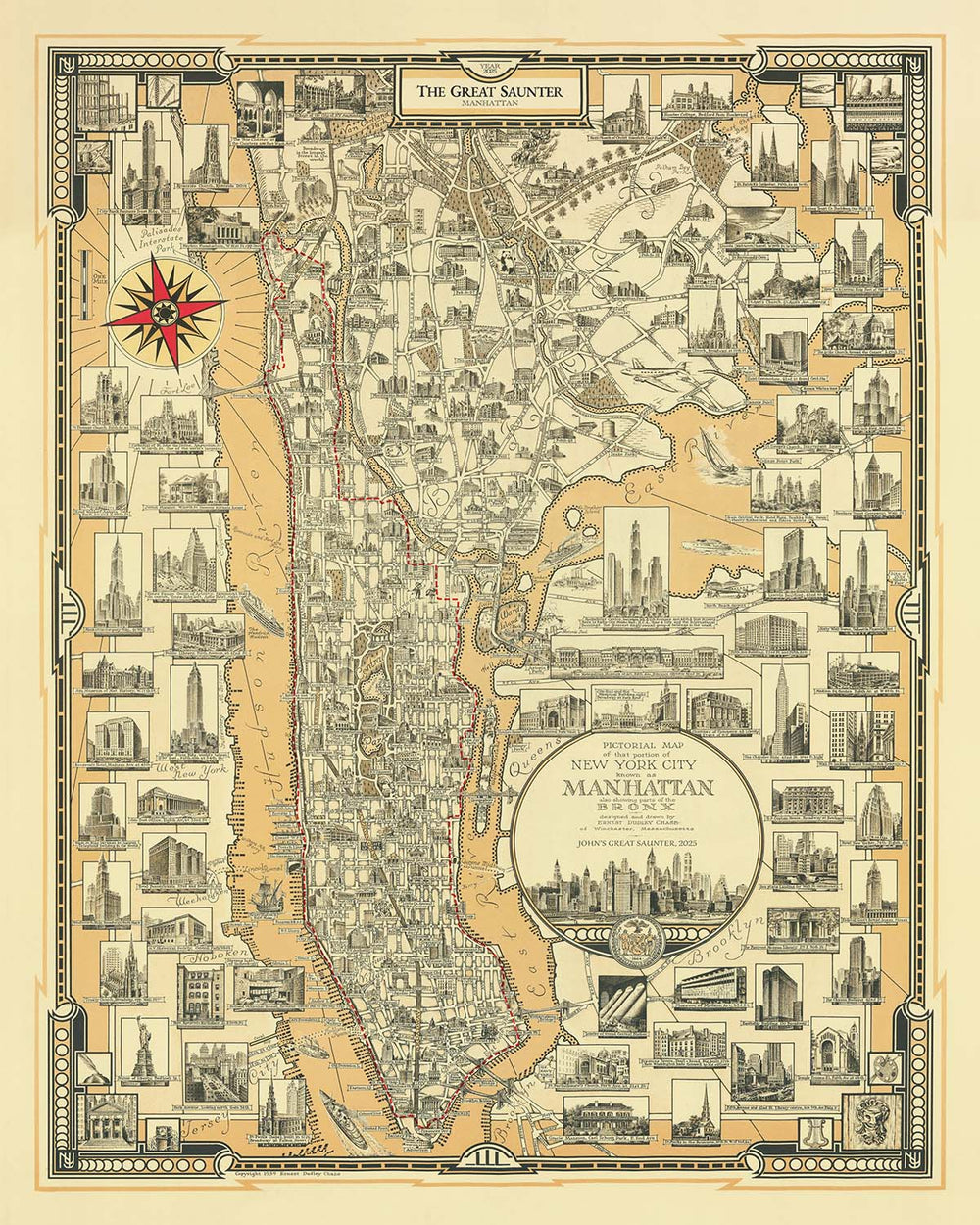 - Depicts The Great Saunter, a 32-mile hiking route around Manhattan’s shoreline