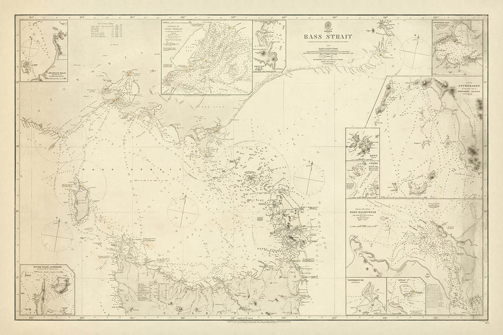 Step into the world of 19th-century exploration with this exquisite nautical chart of the Bass Strait, meticulously surveyed by Commander John Lort Stokes and the officers of H.M.S. Beagle in 1843. This map is a testament to the adventurous spirit and scientific rigor of the British Navy's hydrographic surveys, aimed at mapping uncharted territories for navigation and research. The chart is adorned with detailed inset mappings of various harbors and islands, providing a comprehensive view of the strategic Bass Strait, which separates Tasmania from mainland Australia.
