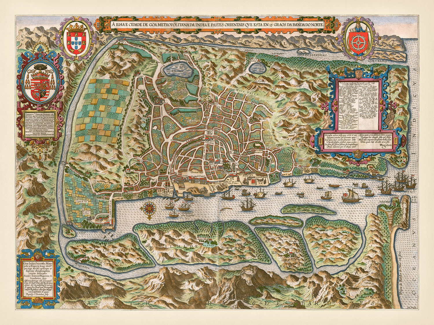 - Details: Decorative and detailed, showing the city and harbor of Goa.
