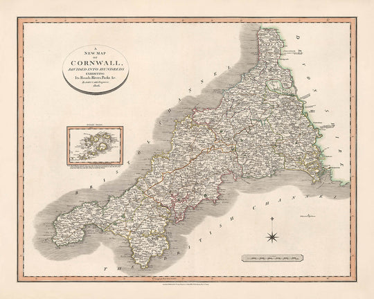 A New Map of Cornwall, Divided into Hundreds, crafted by the esteemed cartographer John Cary in 1806, stands as a testament to the art and precision of early 19th-century cartography. This exquisite map is part of Cary's influential "New English Atlas," a collection that revolutionized county mapping in Great Britain. Known for his meticulous attention to detail, Cary's work captures the intricate geography of Cornwall, showcasing its boundaries, settlements, and natural features with unparalleled clarity. The hand-colored copperplate engraving not only provides a visual feast but also serves as a historical document, reflecting the cartographic advancements of its time.