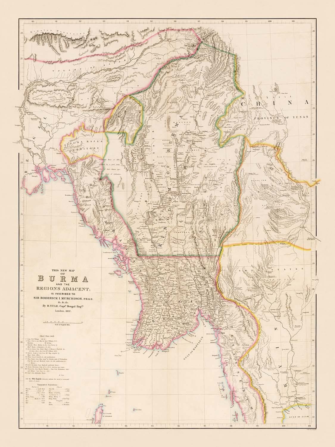 Immerse yourself in the rich tapestry of 19th-century cartography with "This new map of Burma and the regions adjacent," a masterful creation by the esteemed John Arrowsmith. Crafted in 1857, this map offers a captivating glimpse into the political and geographical landscapes of what is now Myanmar and parts of Thailand. The map is a testament to Arrowsmith's meticulous attention to detail, showcasing the intricacies of political boundaries, cities, and natural features with precision and artistry. Each hand-colored engraving invites you to explore a world where cartography was both a science and an art.