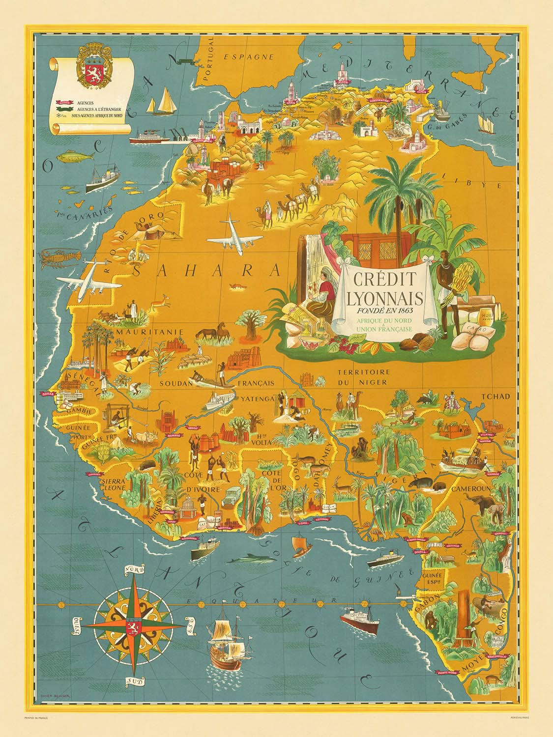 Discover the captivating artistry of Lucien Boucher with the "Crédit Lyonnais Fondé En 1863 Afrique du Nord Union Française" map, a remarkable piece of mid-20th-century cartography. Created around 1945, this map is a testament to Boucher's distinctive style, blending vibrant colors and intricate illustrations to depict the former French colonies in Africa. As France sought to reassert its economic influence post-World War II, this map served as both a promotional tool for Crédit Lyonnais and a celebration of the rich resources and industries across the continent.
