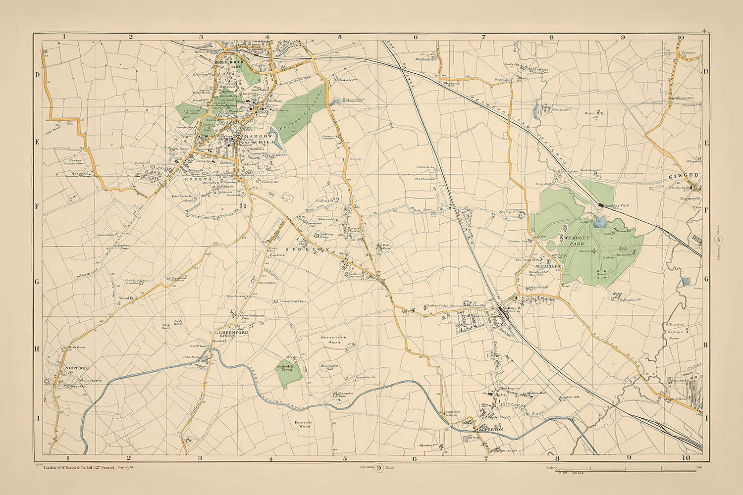 Sheet 4 from Bacon's New Large Scale Atlas of London and Suburbs, crafted in 1900 by the esteemed G.W. Bacon & Co., offers a captivating glimpse into the evolving landscape of Northwest London at the turn of the 20th century. This map artfully captures a city in transition, where Victorian landmarks and terraced housing stand alongside expanses of farmland poised for urban development. The meticulous detail and attractive coloring make this map not only a practical guide but also a visual delight, reflecting the burgeoning growth of one of the world's most dynamic cities.