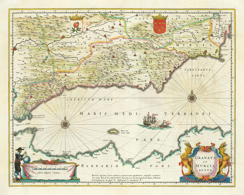 The "Granata et Murcia Regna", created in 1640 by the esteemed Dutch cartographer Willem Janszoon Blaeu, is a masterpiece of 17th-century cartography. This map captures the historic regions of Granada and Murcia in southern Spain, presenting a rich tapestry of political boundaries, geographic features, and maritime significance. Blaeu, a leading figure of the Dutch Golden Age of cartography, was renowned for his precision and artistry, and this map exemplifies his ability to blend functionality with visual splendor. The title cartouche, flanked by mythological figures, immediately draws the eye, setting the tone for a work of both historical and artistic importance.