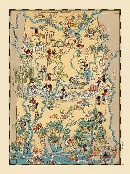 Step into the vibrant world of 1930s America with "Alabama..", a captivating pictorial map created by the renowned Ruth Taylor White in 1935. This map, originally published as part of a whimsical atlas, offers a delightful visual journey through the heart of Alabama, blending historical insight with playful artistry. The original title, simple yet evocative, sets the tone for a piece that both informs and entertains, capturing the essence of the state during a transformative era in American history.