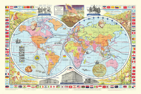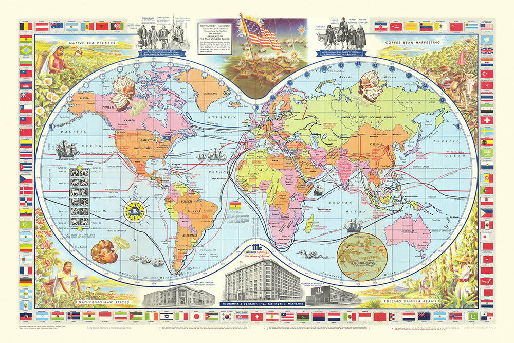 Step into the vibrant world of mid-century cartography with the captivating "Coffee, Tea, Vanilla & Spices / Pictorial Map of the World," created by McCormick & Company in 1957. This remarkable map is more than a simple depiction of global geography; it is a celebration of the spice trade’s storied past and McCormick’s pivotal role in shaping the modern flavor industry. Commissioned as a decorative promotional piece, the map elegantly weaves together the company’s heritage with the sweeping saga of exploration, commerce, and the enduring allure of the world’s most sought-after spices.