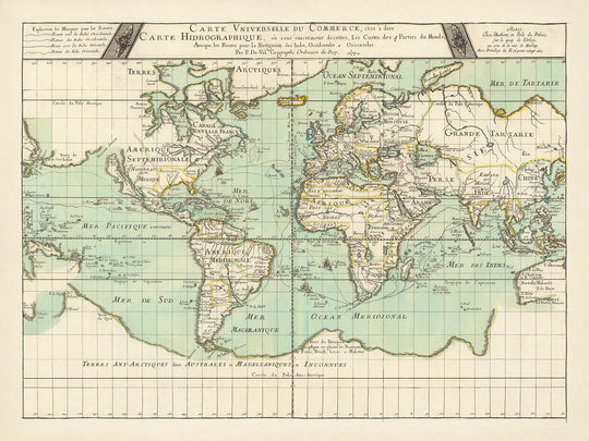 Historically, the "Carte universelle du commerce" is a significant artifact that encapsulates the commercial and navigational priorities of its time. It serves as a historical document that reveals the trade dynamics, geopolitical landscapes, and the adventurous spirit of an era driven by exploration and commerce. Owning this map is akin to holding a piece of history, a beautifully crafted testament to the age of discovery and the enduring quest to chart the unknown.