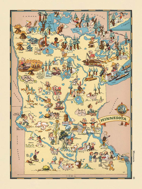 The natural splendor of Minnesota is front and center, with lakes, rivers, and forests rendered in vibrant detail. The state’s reputation as the “Land of 10,000 Lakes” is celebrated through illustrations of fishing, canoeing, and abundant wildlife, while the northern forests teem with imagery of the timber industry. The map’s waterways are alive with steamboats and canoes, and the winter landscape is dotted with scenes of skiing and ice fishing, highlighting the state’s enduring connection to outdoor recreation. Each pictorial element serves as a window into the region’s geography and the livelihoods it has supported for generations.