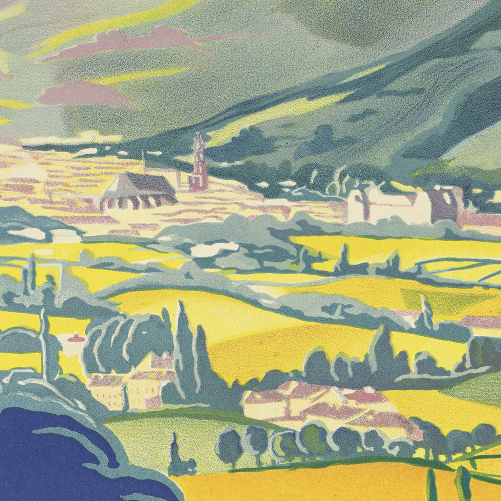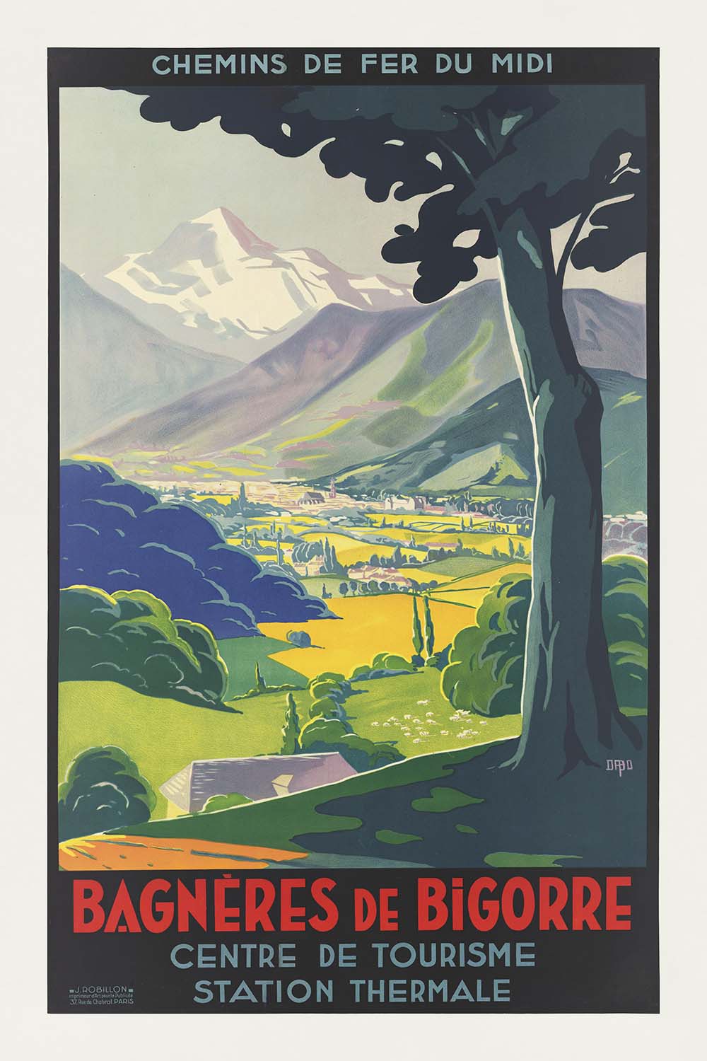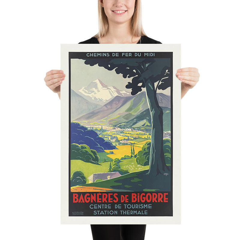 Chemins de fer du Midi. Bagnères de Bigorre – centre de tourisme, station thermale by Dabo is a classic French railway poster celebrating the Pyrenean spa town of Bagnères-de-Bigorre. Commissioned for the Chemins de fer du Midi— the regional network that served southwestern France before its 1937 integration into the national railways—this design promotes the town’s celebrated thermal waters and alpine air. The composition leads the eye through a verdant valley toward sunlit peaks, capturing the promise of restorative travel in the interwar era.