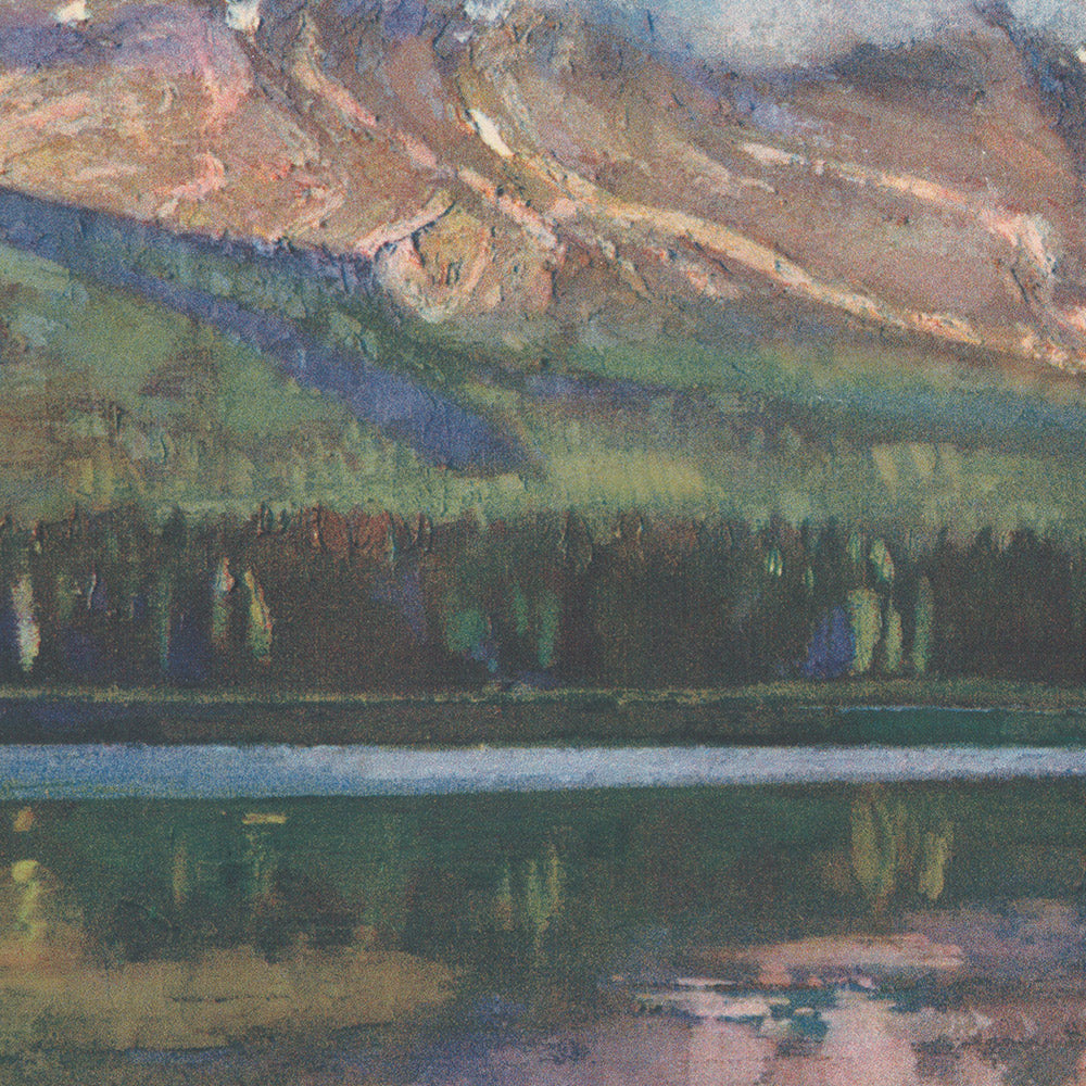 Krollmann’s composition is a masterclass in calm and balance. Blues and greens dominate, interwoven with soft earth tones, while crisp whites and cool grays articulate the mountain’s light-struck slopes. Gentle, organic shapes of fir and pine create a rhythmic border that guides the gaze upward, and the glassy reflection doubles the triangular silhouette of the peak, amplifying its presence. The layered color fields deepen the sense of space without sacrificing poster clarity, making this an image that reads beautifully at a distance yet rewards close inspection. For collectors of railway ephemera and lovers of Northwestern scenery alike, it’s an emblematic blend of artistry and wanderlust.