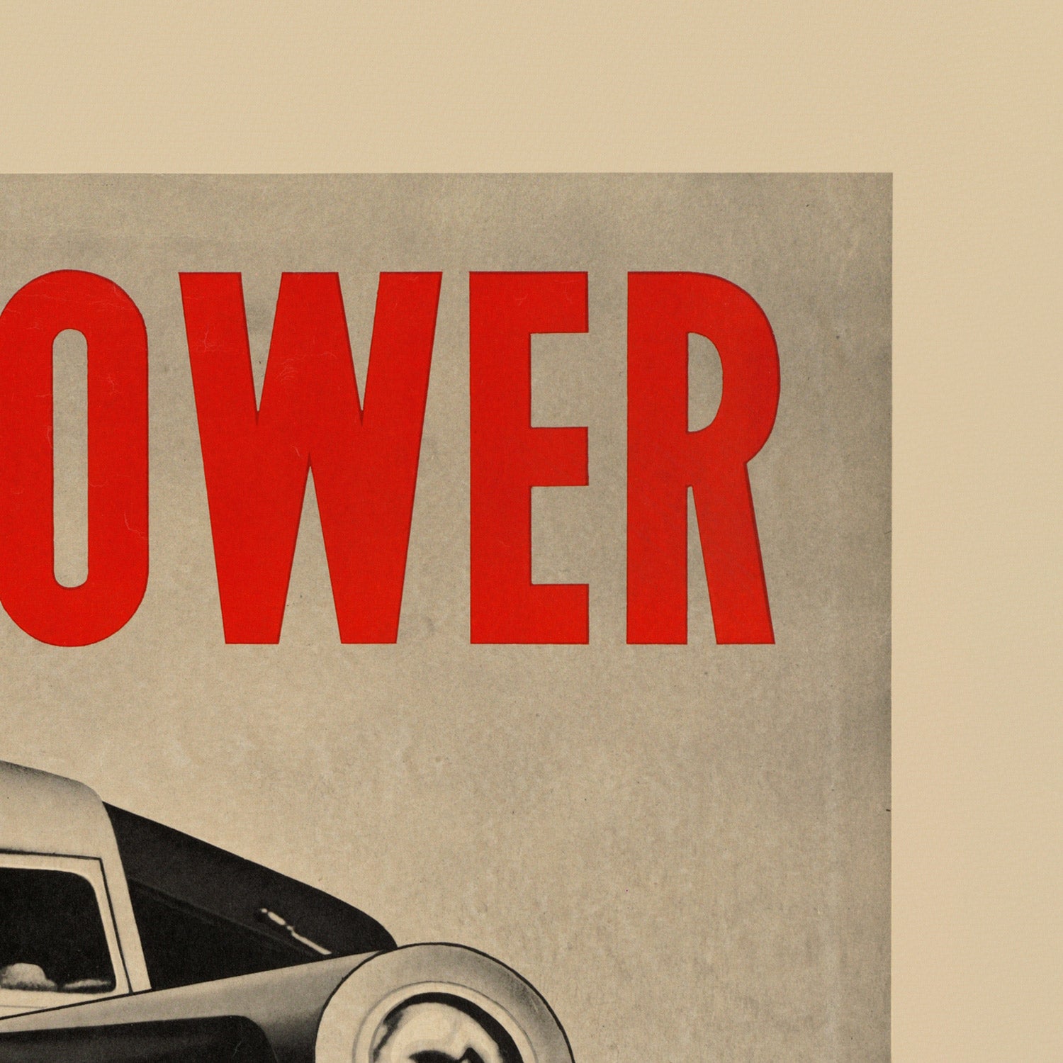 Design and color: a commanding red headline spans the top, while the train’s nose surges diagonally into the frame, its white pinstripes and reflective panels carved against deep black. A vivid red band grounds the composition at the bottom, where a small side‑view silhouette of the full train glides along the track. The warm beige field around the image gives the print a gallery‑ready calm that balances its industrial power—ideal for interiors that favor bold mid‑century graphics and a confident palette of red, black, and cream.