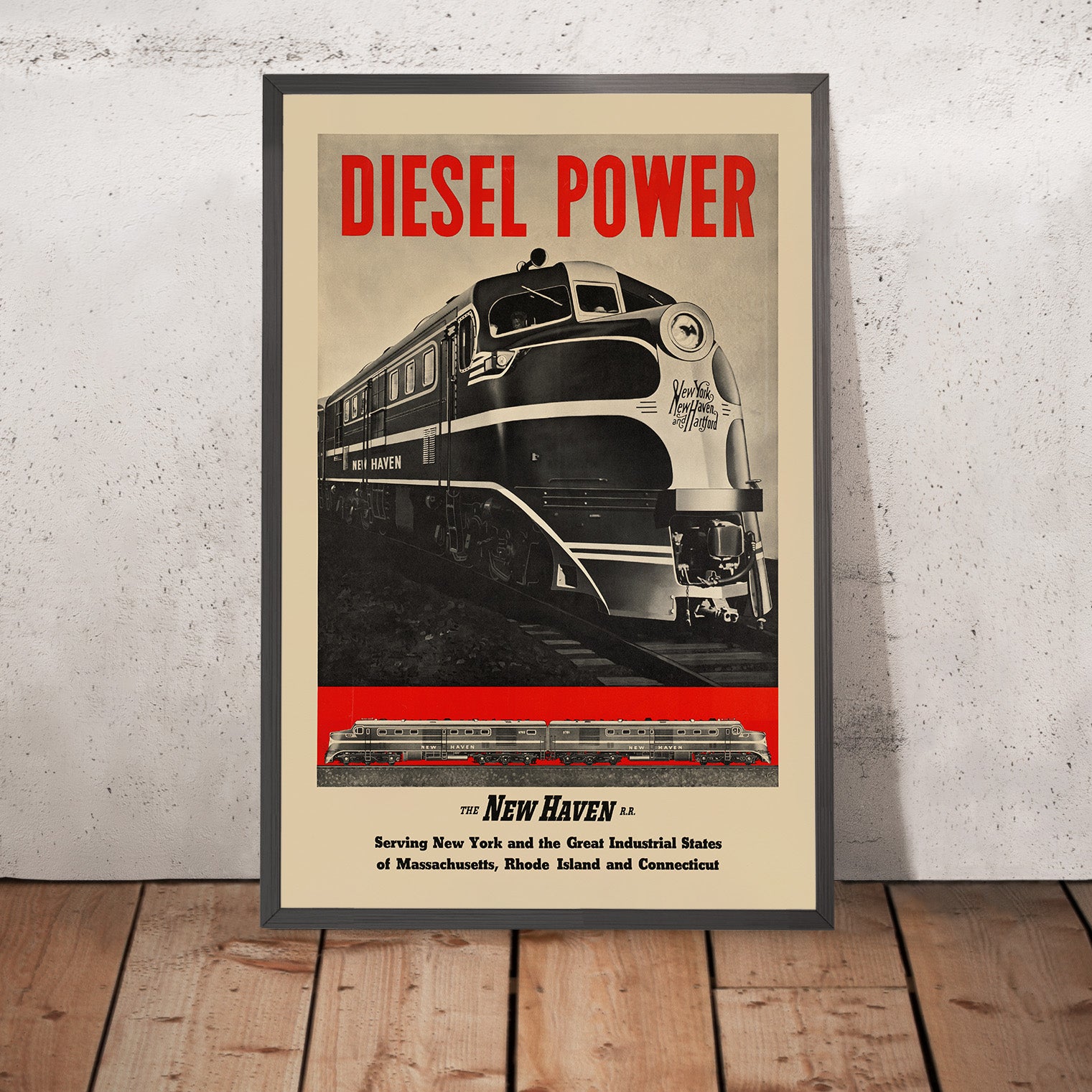 Why this subject matters: dieselization transformed travel in the Northeast, powering express services between New York and hubs such as New Haven, Hartford, Providence, and beyond. The poster itself proudly states the service area—“Serving New York and the Great Industrial States of Massachusetts, Rhode Island and Connecticut”—making it a perfect memento for anyone with ties to these places.