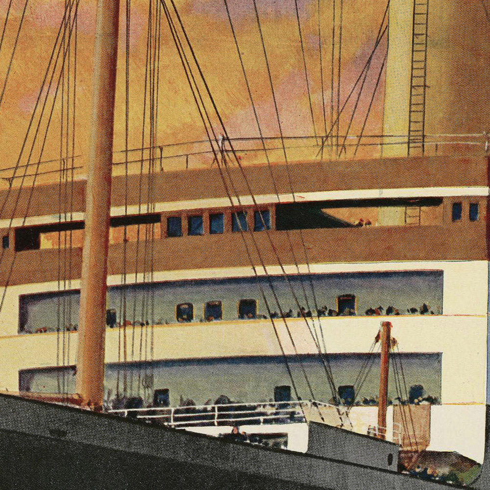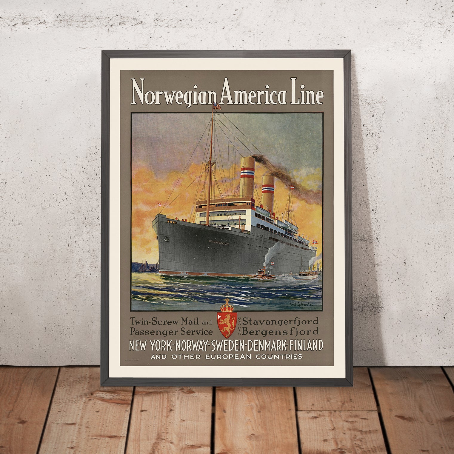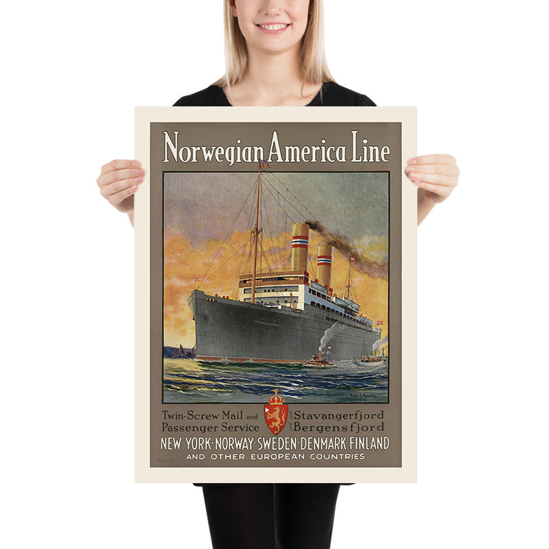 Why this poster matters: Norwegian America Line connected Norway’s principal ports with New York during a transformative era of migration and leisure travel. The “Stavangerfjord,” depicted here, stood for reliability and elegance, linking families, commerce, and cultures across the Atlantic. Hoertz’s 1924 design distills that narrative into a single view—one that resonates with Norwegian heritage, transatlantic history, and the optimism of travel between Old World and New.