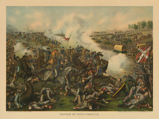 Immerse yourself in one of the most pivotal moments of American history with the chromolithograph "Battle of Five Forks, VA" by Kurz & Allison, originally published in 1886. This captivating antique colour lithograph captures General Sheridan's fierce charge on April 1, 1865, a decisive moment that led to the end of the American Civil War.
