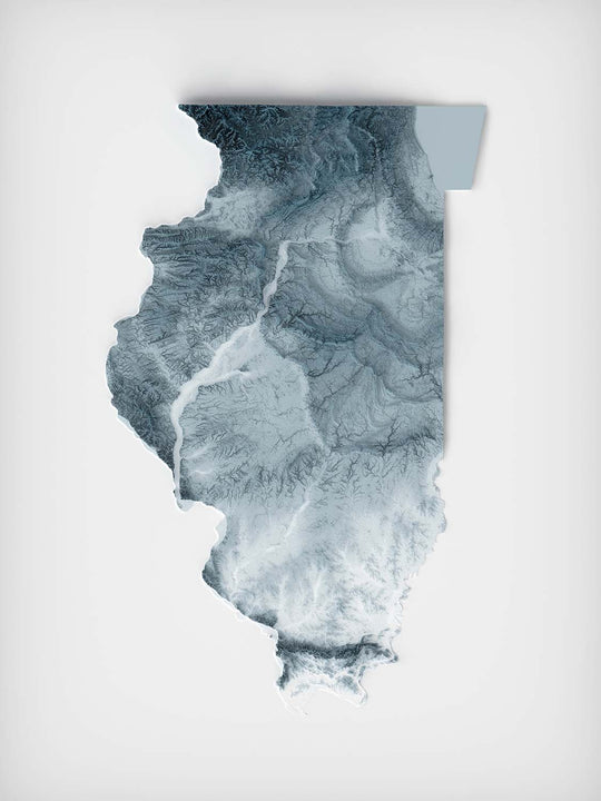 Celebrate the heartland of America with this exquisite depiction of Illinois — a state where sweeping plains meet glacial-carved ridges, and river valleys carve deep stories into the landscape. The map reveals Illinois’s signature geography with dramatic use of shadow and light to bring the gentle undulations and subtle elevation changes to life.