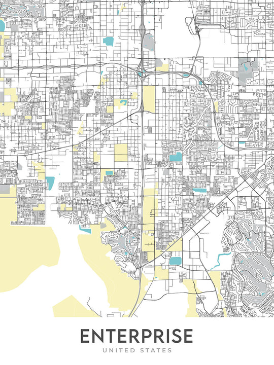 This map of Enterprise, Nevada is a modern and detailed cartographic artwork that focuses on the city's street layout. The map is centered on the city's downtown area, and extends to include the surrounding neighborhoods of West Enterprise, North Enterprise, South Enterprise, and East Enterprise. The map also includes the major roads and highways that connect Enterprise to the surrounding region, including US-95, NV-169, NV-317, and NV-318.