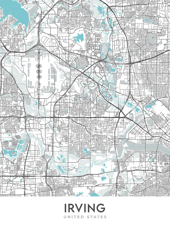This map of Irving, Texas, is a modern, detailed street map without labels. The map focuses on the city of Irving and its surrounding areas, providing an accurate and visually appealing representation of the city's layout. The map covers a wide range of neighborhoods, including Las Colinas, Valley Ranch, West Irving, Irving Mall, Heritage, Plymouth Park, Oak Creek, Cottonwood Heights, Hidden Cove, and The Trails of Williams.
