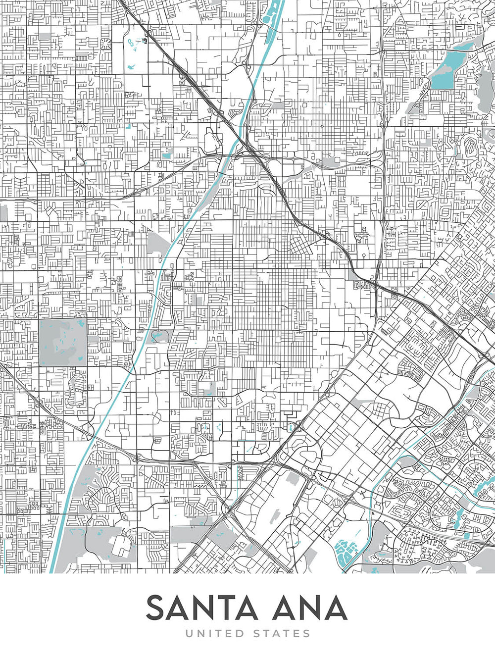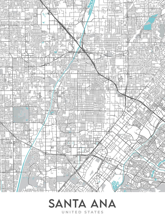 This map of Santa Ana is a must-have for anyone who loves this vibrant city. It is a beautiful and informative piece of art that will add a touch of sophistication to any home or office.