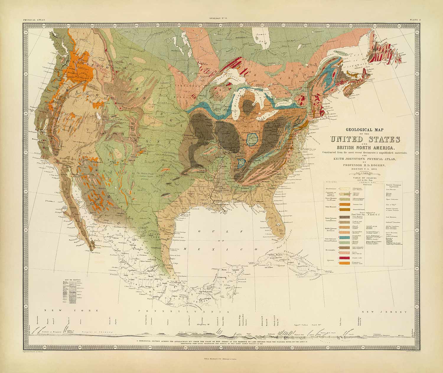 Old Geology Map of the USA and Canada by Rogers & Johnston, 1856: Geological Chart of America