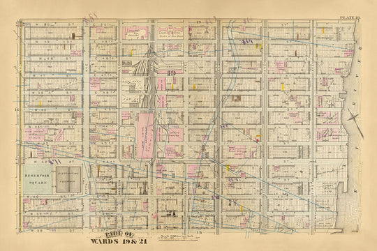 Grand Central Depot, known today as Grand Central Terminal, is prominently featured, a beacon of the city's bustling railway system. Reservoir Square, an area of significant recreational and social importance during the period, is also detailed. The map highlights ward boundaries, water mains, and the dimensions of city blocks, offering invaluable insights into the city's development during the late 19th century.