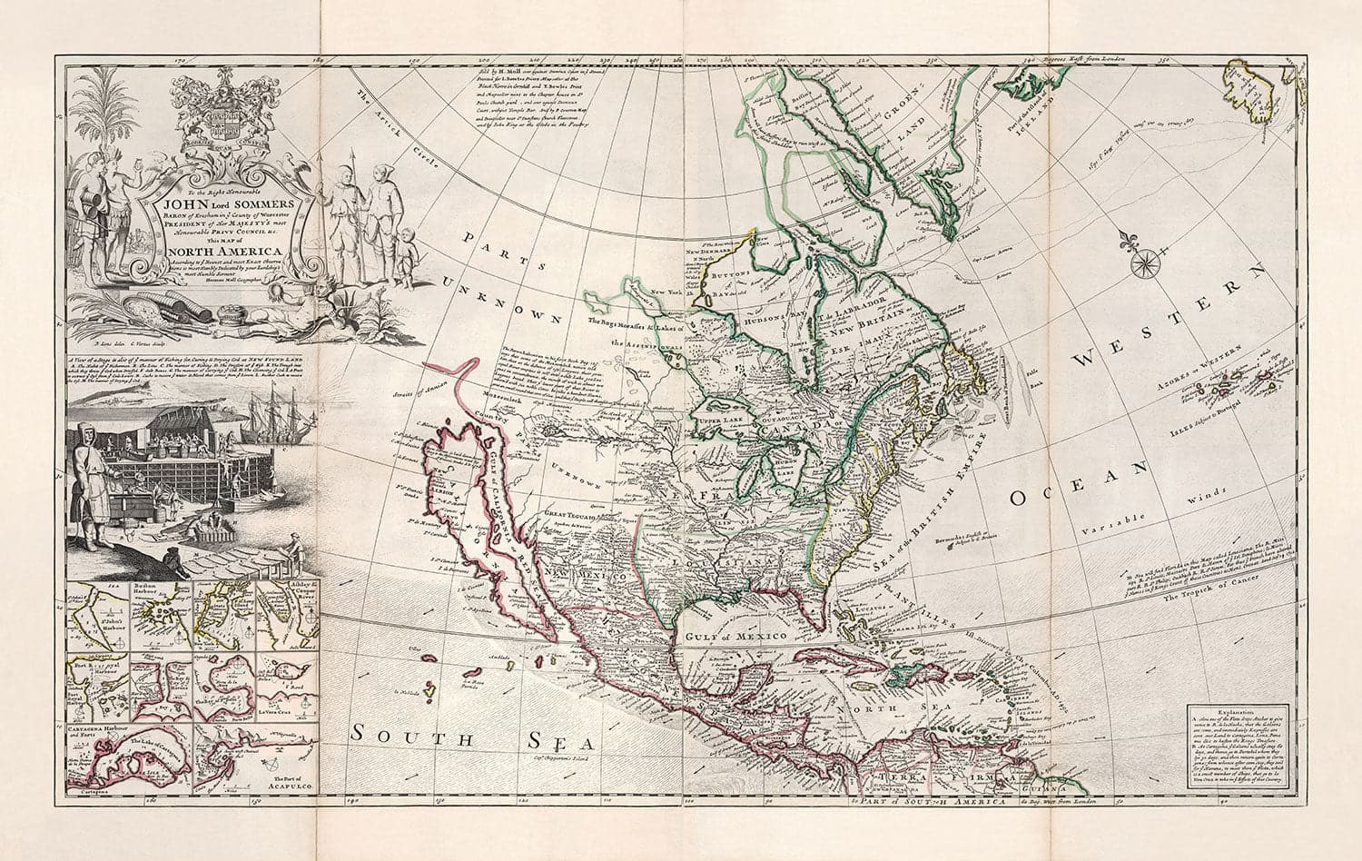 This is one of the earliest and most detailed maps of the whole Atlantic, North America and Pacific regions. It was compiled at an intriguing point of history when most of the middle of the continent was called Louisiana or New France, and Mexico and the West Coast were claimed by Spain. The east coast, of course, was claimed by England!