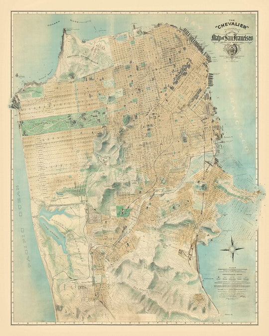 Rivers and parks are elegantly woven into the map’s design, with Lake Merced and Golden Gate Park serving as focal points of natural beauty. These features highlight San Francisco’s unique geography and the importance of green spaces in urban planning. Chevalier’s depiction of these areas reflects a harmonious balance between urban development and nature, a vision that was forward-thinking for its time. The map invites viewers to appreciate the city’s landscape in its entirety, from bustling streets to serene parklands.