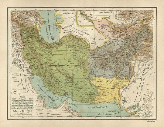 Old Arabic Map of Iran, Pakistan, Afghanistan and Uzbekistan in 1891: Arabia, Kuwait, Persian Gulf, Caspian Sea, USSR