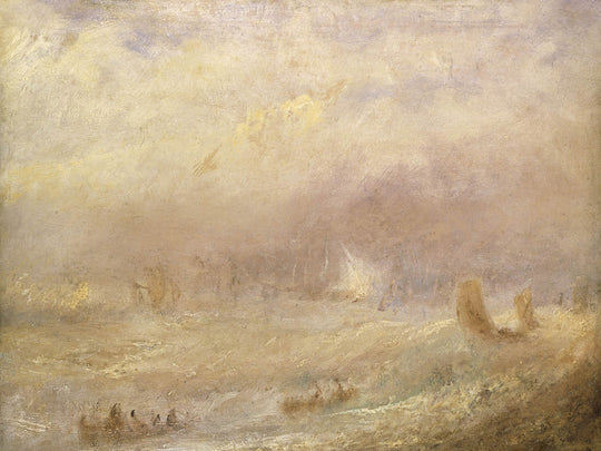 A View of Deal stands out for its breathtaking attention to the fleeting qualities of light and the tranquil drama of its seascape. The painting softly glows with rich, golden yellows and gentle beiges—signature hues in Turner’s palette—that infuse the horizon and sky with warm luminescence. The subtle gradations from dawn to daylight across the canvas lend a hazy opulence while delicately contrasting with the blue-gray, placid tidal waters below. Turner's mastery of color harmonies and expressive brushwork in this piece evokes an ethereal sense of calm and nostalgia.