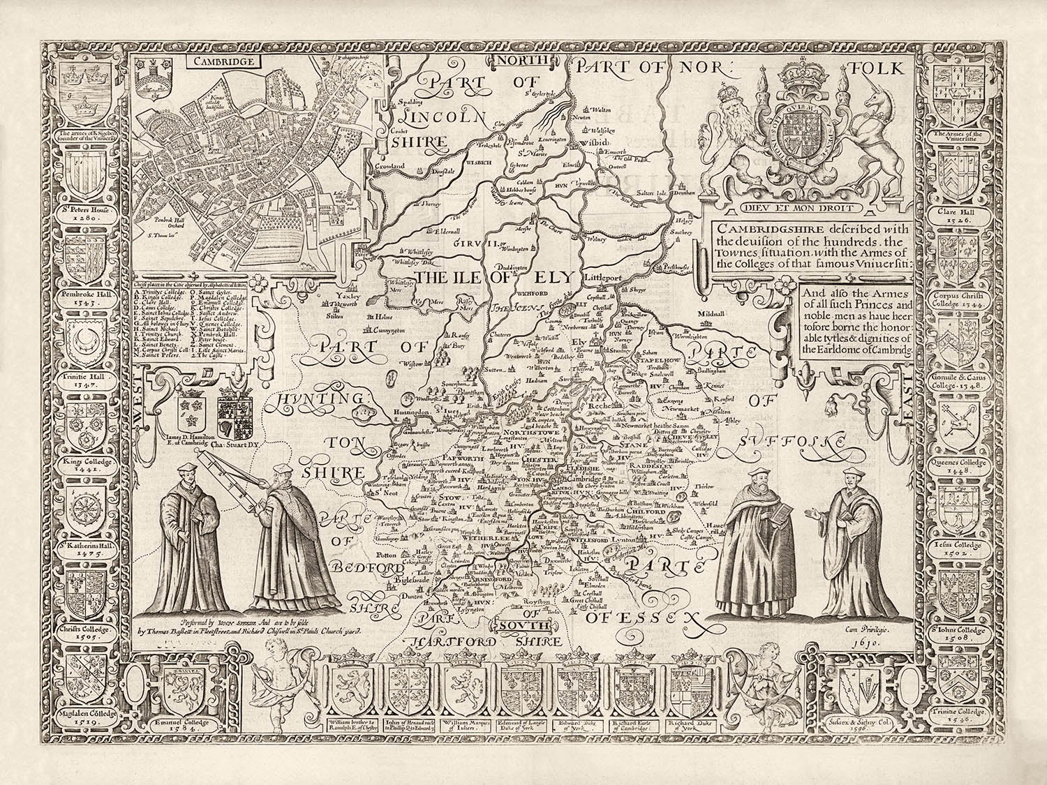 The zoomed-in map of Cambridge shows some of the university colleges that already existed in 1611, such as Trinity College, Kings College, Corpus Christi, Magdalene, Queens, Clare Hall, Christ's College and Peterhouse (then called St Peters House). The coats of arms for 15 colleges adorn the left and right side of the map. Really, it's all rather beautiful.