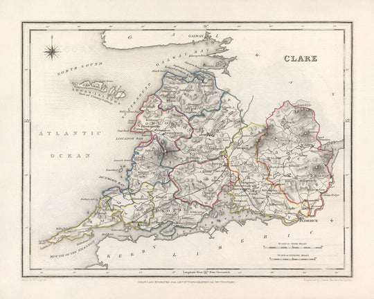 Own a piece of history with this Old Map of Clare by Samuel Lewis in 1844. Explore the past, uncover forgotten towns, and marvel at the beauty of County Clare as it was over a century ago.