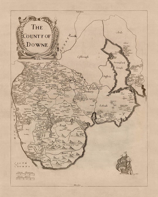 This map, titled 'County Down', is a detailed political and physical map of County Down, Ireland, originally published in 1685 by Sir William Petty. It is a later, reduced scale map based on the Down Survey of Ireland, the first ever detailed land survey on a national scale anywhere in the world. The purpose of the survey was to measure lands which, following the calamitous English Civil War, much of which was fought on Irish soil, were to be taken from Irish Catholic landowners and given to English Protestants.