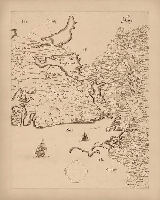 This map of County Galway, originally published in 1685 by Sir William Petty, is a detailed political and physical map that provides a wealth of information about the region. The map is based on the Down Survey of Ireland, the first ever detailed land survey on a national scale anywhere in the world, which was undertaken from 1656 to 1658. Petty's map is a reduced scale version of the original Down Survey, but it still manages to pack in an impressive amount of detail.