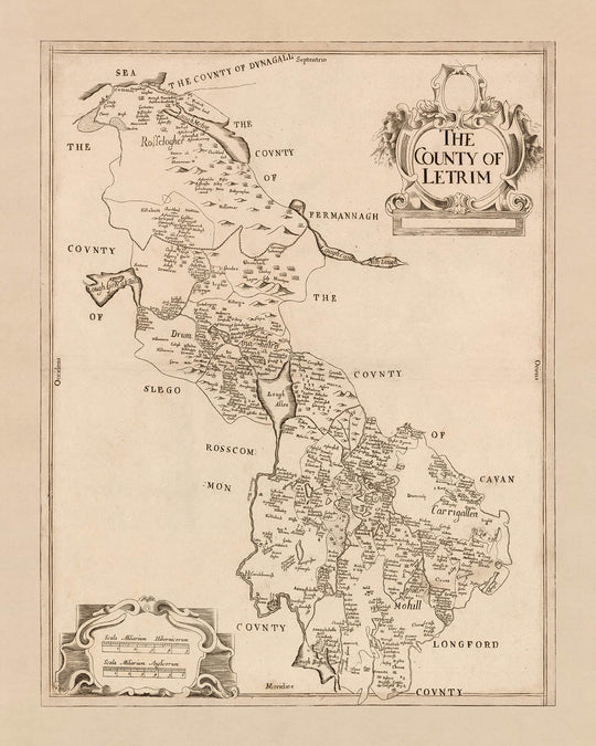 This map of County Leitrim, published in 1685 by Sir William Petty, is a detailed political and physical map that provides a wealth of information about the county and its surroundings. The map is based on the Down Survey of Ireland, which was conducted between 1656 and 1658, and is considered to be the first ever detailed land survey on a national scale anywhere in the world.
