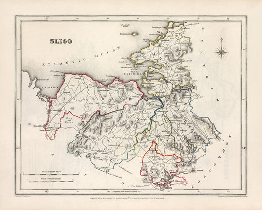 The Old Map of Sligo by Samuel Lewis, created in 1844, is a captivating and historically significant piece that offers a glimpse into the past of County Sligo, Ireland. This meticulously crafted map showcases the region's distinctive features, towns, and cities, providing an invaluable resource for history enthusiasts, cartography aficionados, and anyone with a deep appreciation for the rich heritage of Ireland.