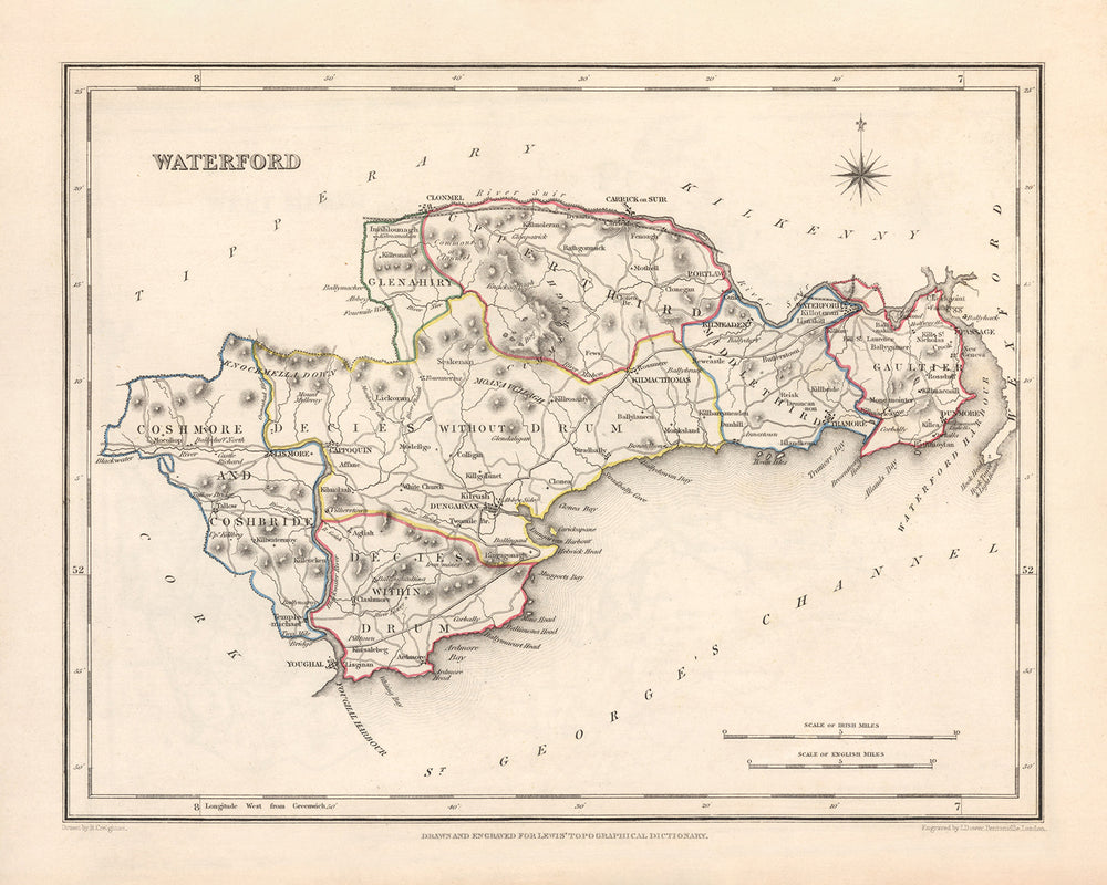 Old Map of County Waterford by Samuel Lewis, 1844: Dungarvan, Lismore, Cappoquin, Tramore, Dunmore East