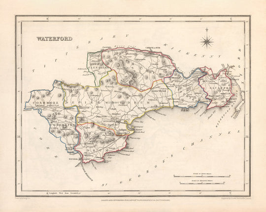 This Old Map of Waterford by Samuel Lewis in 1844 showcases the historical boundaries of County Waterford, Ireland, and provides a glimpse into the past. With its intricate details and exquisite craftsmanship, this map is a fascinating piece of history that captures the essence of the region during that time period.