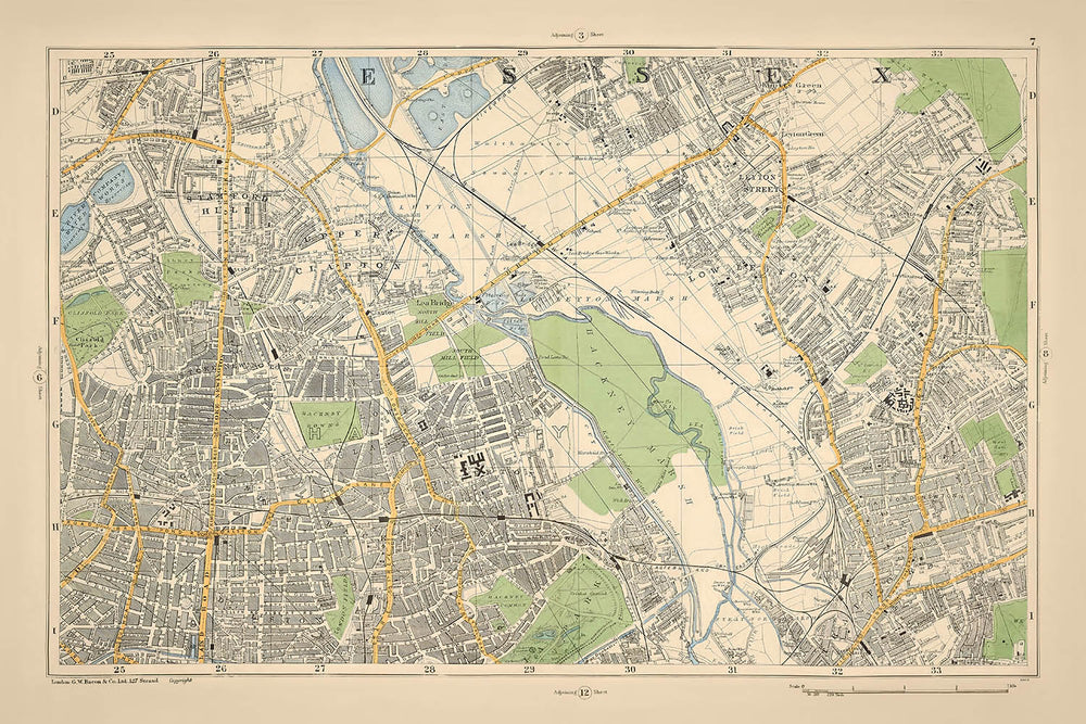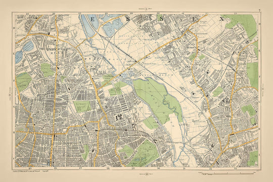 Step into the vibrant history of London with "Sheet 7 from Bacon's New Large Scale Atlas of London and Suburbs," crafted in 1900 by the esteemed Bacon & Co. This map captures East-Central London at the dawn of the 20th century, a period marked by rapid urban expansion and the solidification of Victorian architectural grandeur. As you explore this exquisite piece, you'll traverse neighborhoods like Stamford Hill and Upper Clapton, areas that were beginning to transform from pastoral landscapes into bustling urban communities.