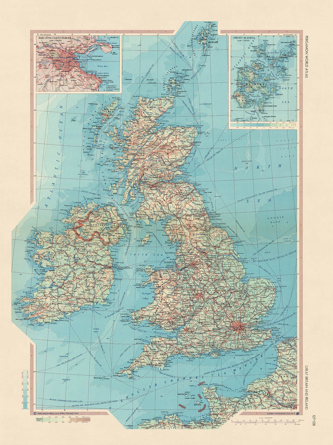 This 1967 map of Great Britain and Ireland by the Polish Army Topography Service is a detailed political and physical map that provides a comprehensive overview of the British Isles. The map is centered on the British Isles, with the surrounding countries of France, Belgium, the Netherlands, Denmark, Norway, Sweden, and Iceland shown in inset maps. The map also includes detailed insets of Dublin (Baile Atha Cliath) and the Orkney Islands.