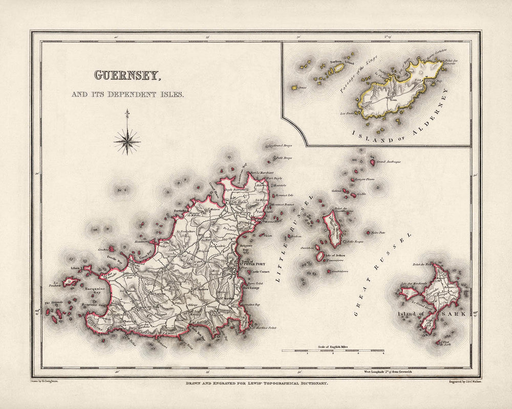 This old map of the Island of Guernsey, Channel Islands, created by Samuel Lewis in 1844, is a captivating piece of history that offers a glimpse into the past. With its intricate details and exquisite craftsmanship, this map serves as a testament to the artistry and precision of cartographers from the 19th century.