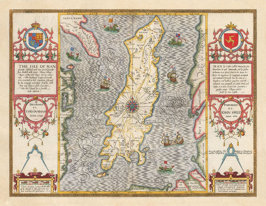This old, full colour and exceedingly rare map shows the ancient county of the Isle of Man in 1611. It was created by John Speed and engraved by Jodocus Hondius, and originally published in Speed's "The Theatre of the Empire of Great Britaine".
