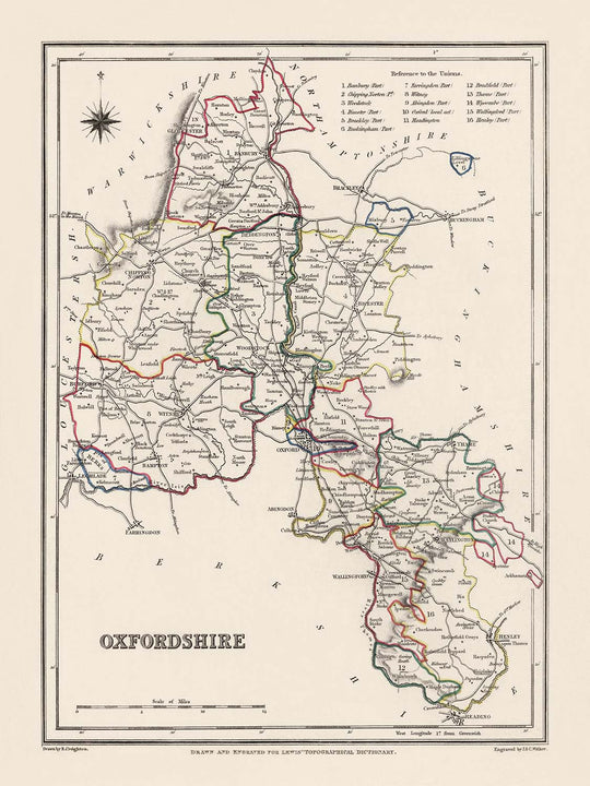This exquisitely detailed and historically rich map of Oxfordshire from 1844 by the notable cartographer, Samuel Lewis, provides a fascinating snapshot of one of England's most historic counties during a period of immense social and industrial change. Every hand-drawn line and painstakingly etched name tells a story of a time and place that laid the foundations of the modern Oxfordshire we know today. Each settlement, from the smallest hamlet to the largest town, offers a window into the past, some of which have grown into modern cities while others have remained charmingly unaltered over the centuries.