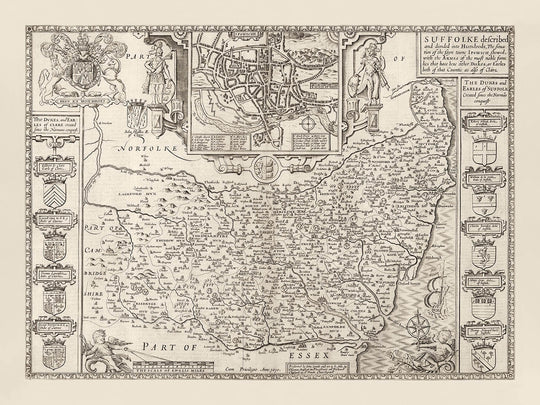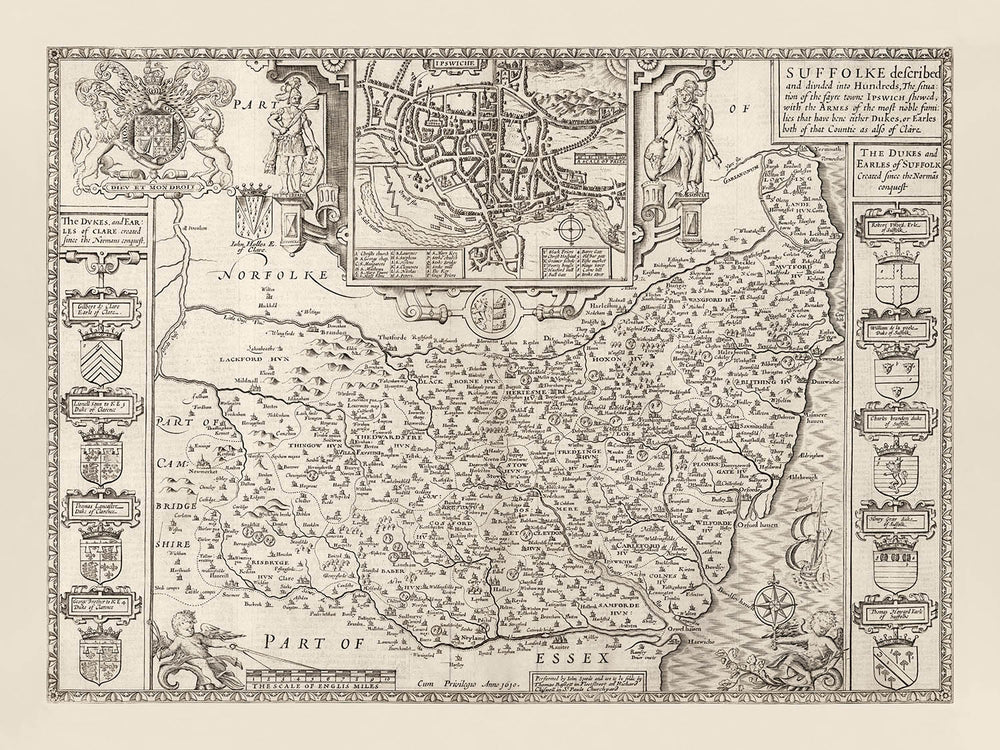 At the top of the map is a detailed engraving of Ipswich, then (and still) the capital of this ancient county. Even by the 1600s Ipswich was fairly well developed - you might even recognise some of the streets from central Ipswich!