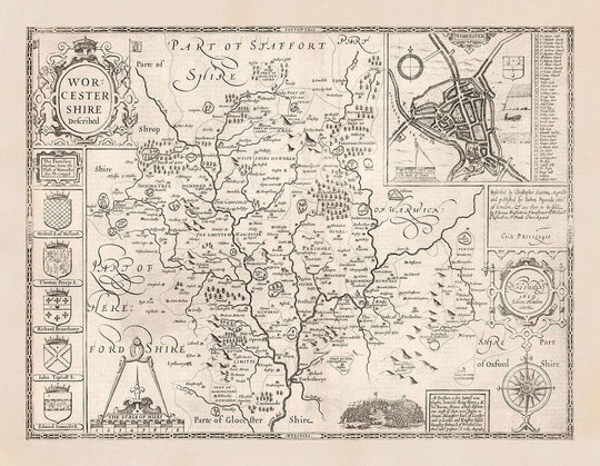 This old, monochrome and wonderful map shows the ancient county of Worcestershire as it was in 1611. It was created by John Speed and engraved by Jodocus Hondius, and originally published in Speed's "The Theatre of the Empire of Great Britaine".