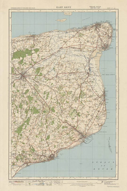 This vintage map, titled "Sheet 117 - East Kent," is a remarkable piece from Ordnance Survey's One-inch "Popular" edition, England and Wales, published in 1925. The map showcases the historic county of East Kent, which is situated in the southeastern part of England. It features several prominent towns, cities, and captivating natural landscapes that make it a fascinating addition to any wall.