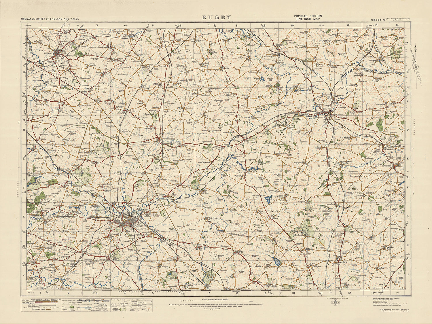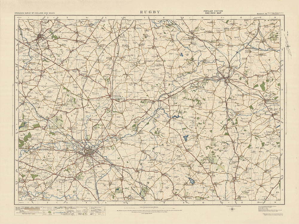 The Old Ordnance Survey Map, Sheet 73 - Rugby, 1925, is a fascinating historical document that provides a detailed glimpse into the towns, cities, and interesting features of the Rugby region in England and Wales. This map, from Ordnance Survey's One-inch "Popular" edition, offers a wealth of information about the area, including notable settlements, boundaries, rivers, and historical events.